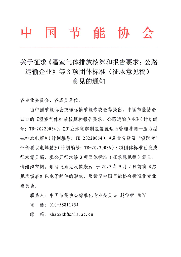 關(guān)于征求《溫室氣體排放核算和報告要求:公路運(yùn)輸企業(yè)》等3項團(tuán)體標(biāo)準(zhǔn)(征求意見稿)意見的通知